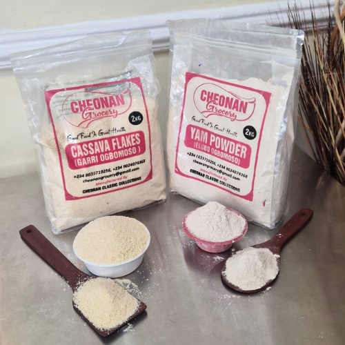 Our product range includes high-quality Cassava Flakes (Garri Ogbomoso) and Yam Powder (Elubo Ogbomoso), carefully processed to meet premium food standards and ensure excellent taste, freshness, and nutritional value. The Cassava Flakes (Garri Ogbomoso) are traditionally prepared using well-selected cassava roots, hygienically processed, and finely textured to deliver an authentic and satisfying experience. These cassava flakes are available in 1kg, 2kg, and 5kg packaging options, making them suitable for individual households, families, and bulk buyers. In addition, our Yam Powder (Elubo Ogbomoso) is produced from high-quality yams, expertly dried and finely milled to preserve its natural flavor and richness. This product is also available in 1kg, 2kg, and 5kg sizes, offering flexibility for different consumption needs, whether for personal use or commercial purposes. Both products are carefully packaged to maintain freshness, ensure a long shelf life, and deliver consistent quality that meets customer expectations. Furthermore, our products are fully compliant with national food safety standards and are NAFDAC approved, assuring customers that they meet all regulatory requirements for safety, hygiene, and quality.